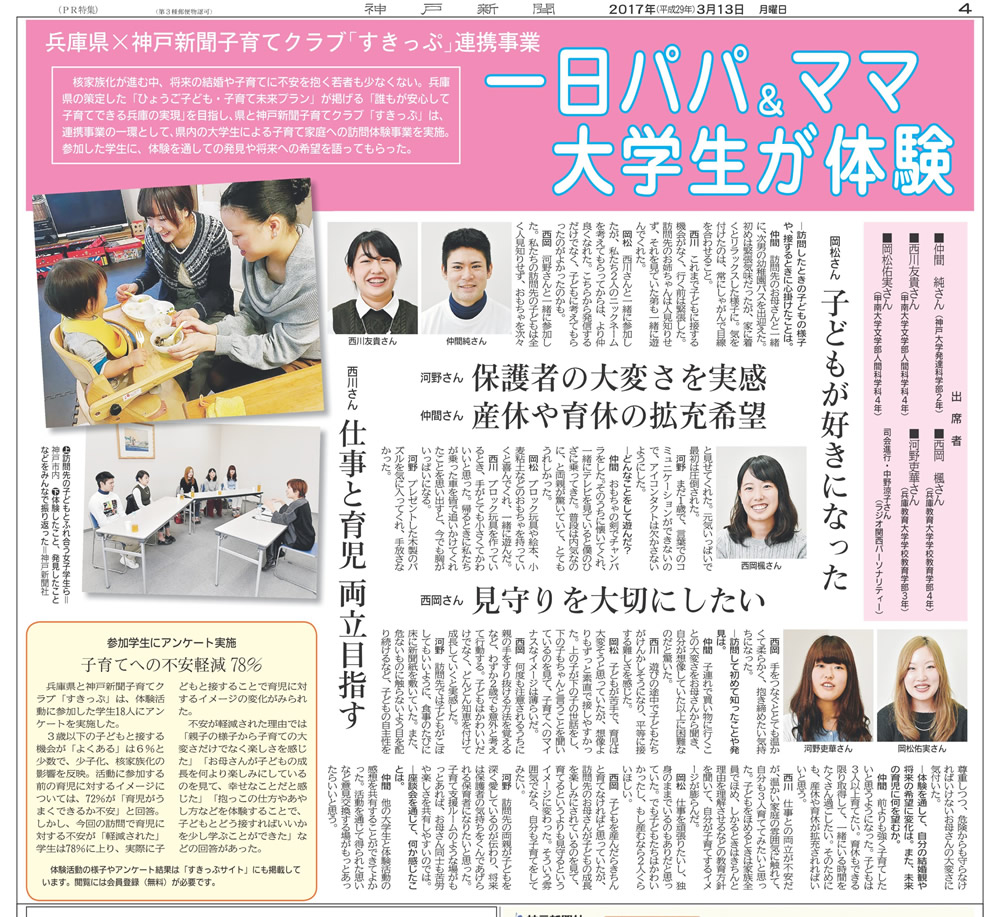 参加学生の座談会を開催。体験の感想や発見、子育てに対する意識の変化、将来への希望などを語ってもらいました。アンケート結果概要も掲載しています。