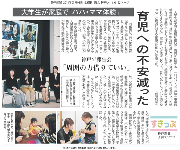 「大学生の一日パパ・ママ体験!報告会」が神戸新聞記事に掲載されました。