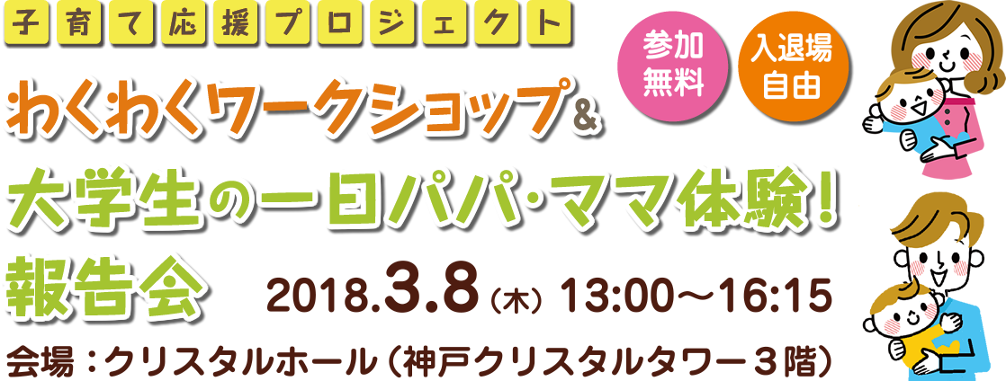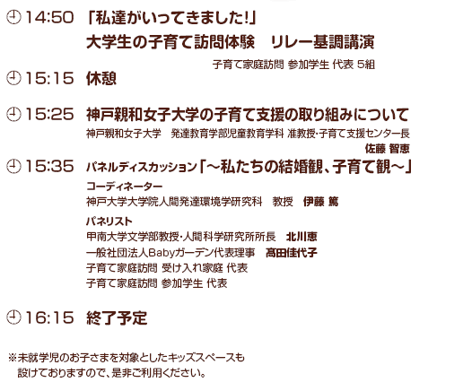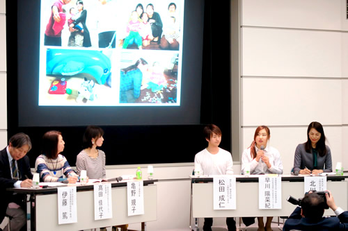 その後、子育て家庭訪問体験の参加大学生12名が、リレー形式の発表や有識者・受入れ家庭・子育て支援団体の代表を交えたパネルディスカッションで、体験の内容や感想、意識の変化について話しました。内容詳細は3月28日神戸新聞特集紙面に掲載されました。