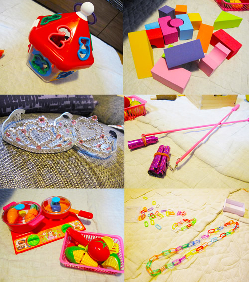 パズルや積み木、ままごとが好きとあったので、それを中心に型はめブロック、スポンジ素材の積み木、ままごとセットを持参しました。また、キラキラが好きだとあったので、ホログラム素材のリボンやティアラ、ビーズチェーンも選びました。