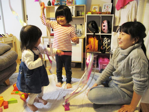 子どもと一緒にチェーンでアクセサリーを作ったり、おままごとを一緒にしたりしました。子どもは持参したリボンが気に入ったようで、それを回すのを見たり、やり方を見せてあげたりもしました。お母さんの育児に対する考えや旦那さんとの役割分担はどうしているのかなどについてもお話しさせていただきました。