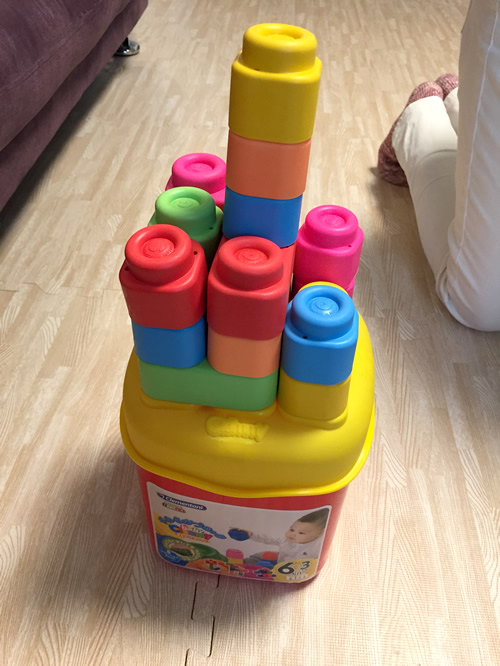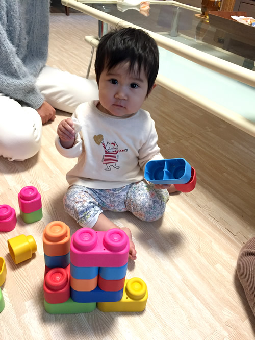 6ヶ月から使えるブロックを持参しました。ブロックは柔らかく、踏んだりしても痛くないところが特徴です。大きくなっても使えるように3歳頃まで使えるものを選びました。また、ブロックの色がカラフルなところも選んだポイントです。最初からブロックに興味を示してくれ、ブロックを崩したり、投げたり、手に持って拍手したりと、喜んでいる様子でした。