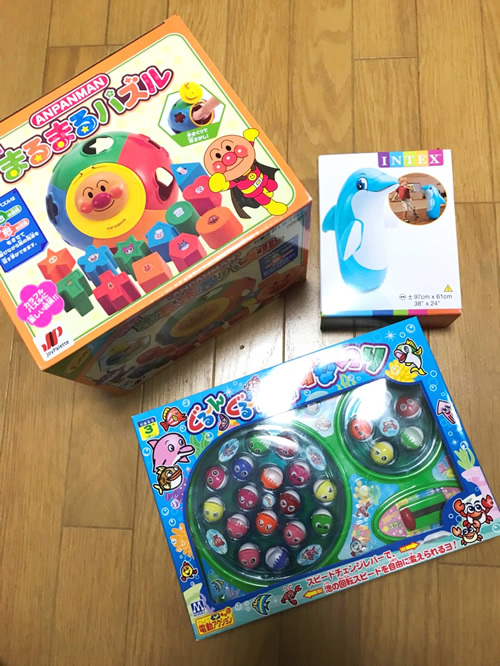5歳男の子と2歳前の女の子で、事前に聞いた情報によると、アンパンマンが好きということで、女の子用にアンパンマンの立体パズル、男の子は一緒に遊べるように魚釣り、2人とも使えるようにサンドバックを買った。