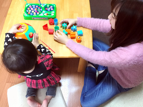 持参したおもちゃを使って、ブロックはめや魚つりゲームをした。また、布団のある部屋で抱きかかえて飛行機ごっこをしたり、録画番組や電車のDVDを一緒に観たりした。家にあったおもちゃでおままごと(ドーナツ屋さんごっこ)をしたり、お医者さんごっこをしたりした。お母さんにおやつを出していただき、子供と一緒に食べた。終盤、子どもがテレビに夢中になっていたのでご両親に子育てに関するお話を伺った。