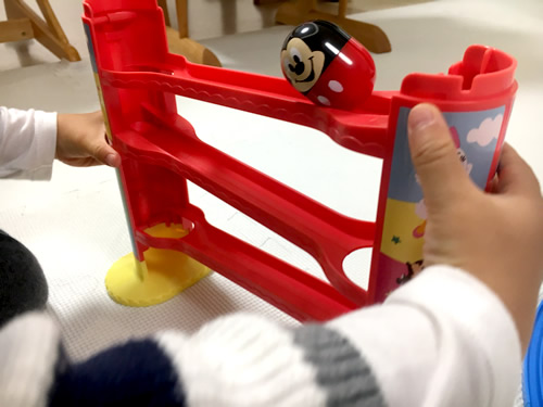 3歳児のお兄ちゃんには、ディズニーのキャラクターが描かれた、坂をボールがコロコロくだっていくおもちゃを持参した。子育て支援センターで遊んでいたとき、そのようなおもちゃに興味を示していたのでそのおもちゃを選んだ。とても喜んで何度も繰り返し遊んでくれていた。 8ヶ月の妹さんにはカラカラ音がなったりカミカミできるようなおもちゃを2つ持参した。どちらも気に入って握ってくれていた。