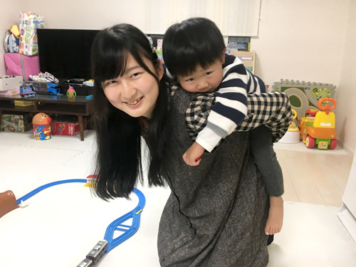 はじめに3歳児のお兄ちゃんと買ってきたおもちゃを出して遊んだ。そのあと家にあるプラレールやブロックなどのおもちゃを出して遊んだ。あとからお昼寝を終えた8ヶ月の妹さんもお母さんに抱っこされて部屋に来てくれて、買ってきたおもちゃを渡した。お兄ちゃんには絵本を読んだり、おんぶして遊んだりした。こまめにお茶を飲ませてあげた。お母さんが妹さんに離乳食を食べさせているところを見た。お母さんが元保育士だったので仕事の話や2児の子育てについてお話を聞いた。