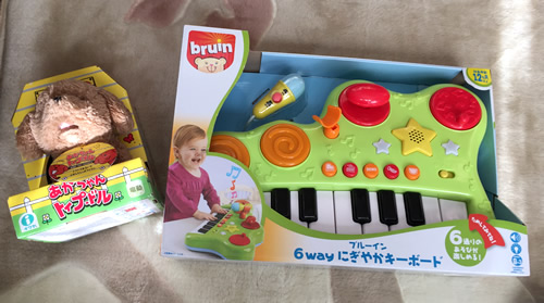 音のなるおもちゃ(キーボード、犬)キーボードは最初の方色々押して遊んでいたが、途中から少しやり方がわかっていないのか、少しあきてしまった。犬のおもちゃは違う向きに動くときは興味しんしんだったが、正面に向かって来られると少し怖がっていた。