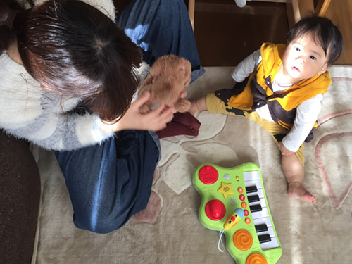 1歳になったばかりで、音がなるおもちゃが好きとのことだったので、電池で動く犬のぬいぐるみのおもちゃと、鍵盤が付いていて色々な音がなるおもちゃを持参した。子どもは、動く犬にはじめ驚いていたが、だんだん慣れてきて掴んだり触ったりできるようになった。鍵盤のおもちゃにも興味を持っていて、自分が押した音がなると喜んでいた。