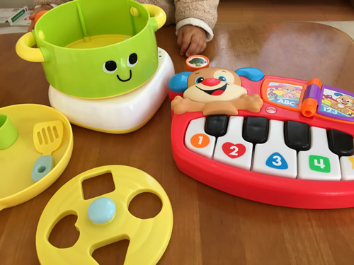 炒める音や煮る音などが出るフライパンとお鍋のセットで、野菜をイメージした入れ物を穴に当てはめることもできるおもちゃと、鍵盤を押すとドレミの音や音楽、更にスイッチを切り替えると英語の音声にもなり英語にも触れられるおもちゃを持参しました。触って音が出るおもちゃが好きとの事だったので、それを意識して選びました。実際にボタンや鍵盤を何度も押して遊んでくれました。