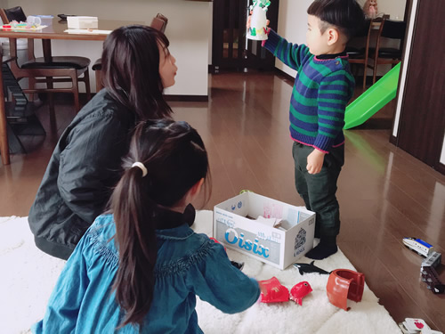 訪問時には、主に私たちが買っていった玩具で遊びました。その他には、お宅にある絵本をいっしょに読んだり、積み木でおままごとをしたりしました。また、トランポリンがあり、飛んだり跳ねたりするところを私たちが見守りつつ遊びました。