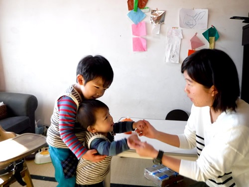 まず、一緒におやつを食べた。子どもたちは子ども用のお菓子を食べていた。次にブロックで車などを作ったり、一緒に絵本を見たりした。家の中でいろいろな話をしながら一緒に遊んだ。後半は、外で三輪車や乗用玩具で遊んだ。ごっこ遊びが好きなお兄ちゃんとはいろいろなごっこ遊びをした。弟は年齢が小さかったので、絵本を読んであげたり、音のなるおもちゃを鳴らしてあげたりした。