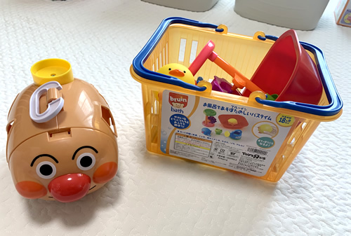 アンパンマンのブロックと水遊びなどで使えるおもちゃの詰め合わせを選んだ。2つ持って行ったら2つを合わせて遊んでいて、そのような遊び方もあるんだなと勉強になった。やはりアンパンマンの方が気に入っていて握ったり触ったりして遊んでいて笑顔をみせてくれた。