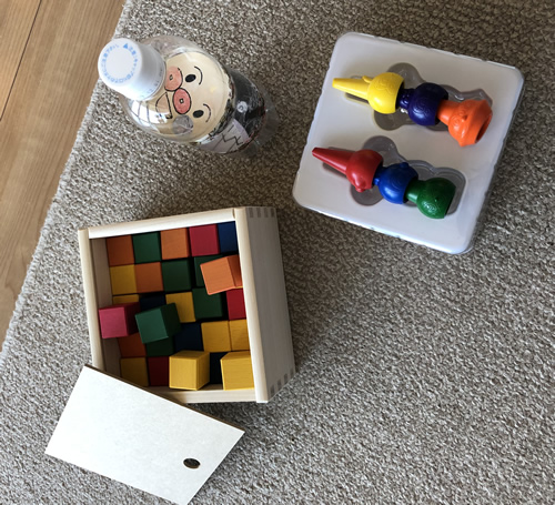 アンパンマンの握って描けるタイプのクレヨンと、くもんの図形キューブつみきを持参しました。図形キューブは、箱から出すとキューブを手でかき回すように床に散らばらせて音を鳴らして楽しんでいました。クレヨンは青色が気に入ったようで、少し描いてはおかあさんに見せに行く姿がとても印象的でした。