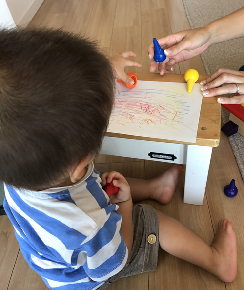 積み木、クレヨン、ビー玉落とし(自作)積み木は、積むのが難しいらしくバラバラにして積み木同士がぶつかる音を楽しんでました。クレヨンは、持ちやすい形だったので興味津々で、画用紙いっぱいに絵を描いてお母さんや私たちに見せてくれました。ビー玉落としは、まだ穴にビー玉を落とすのは難しいので音を楽しんでいました。