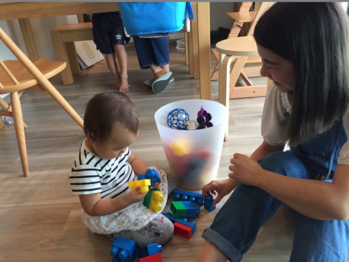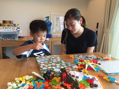 私たちが持ってきたおもちゃで遊んだり、お兄ちゃんはすごろくやLEGOで遊んでいました。妹ちゃんはお兄ちゃんの遊んでいるものに興味を持っていて一緒に遊んだり大きいおもちゃで遊んでいました。