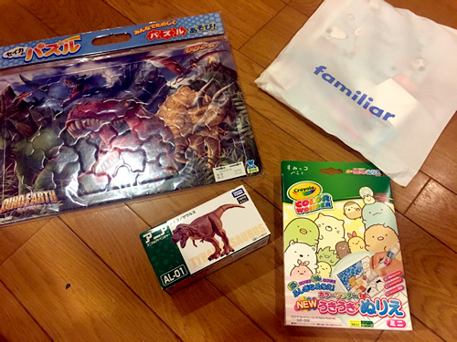 3歳の長男にはティラノサウルスのおもちゃと恐竜のパズル7歳の長女にすみっこぐらしのぬり絵とスヌーピーの文房具を買いました。みんなで一緒に遊べるおもちゃがいいなぁと思って選びました。一緒に遊んでいくうちにこの恐竜は空を飛ぶんだよ。とかこのスヌーピー書いたことある!などコミュニケーションが増えていきました。