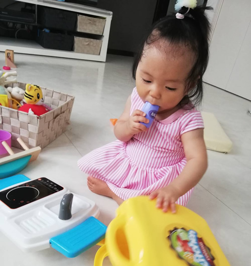 保護者の方から事前にメールでリクエストして頂いていた鞄の形をしたおままごとセットを持参しました。何にでも興味を持ち、口にいれるということでしたので、口にいれても安全なものを選びました。お子様は開封している間もとても興味を持ってくれていて、手に持っては咥えたり手渡したりしてくれていました。