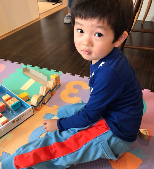 4歳の男の子とは、積み木で家を作ったり、絵本を一緒に読んだり、プラレールで電車を走らせたりして遊びました。2歳の男の子とも同様に遊びました。また、ゼリーやスイートポテトをおやつに出していただいて、子どもたちと一緒に幼稚園での芋掘りの話や好きな遊びの話などをしながら楽しくいただきました。5ヶ月の女の子は、持参した音の鳴るおもちゃを鳴らすととても喜んでいました。抱っこもさせてもらい、この時期の赤ちゃんの重さを実感することができました。