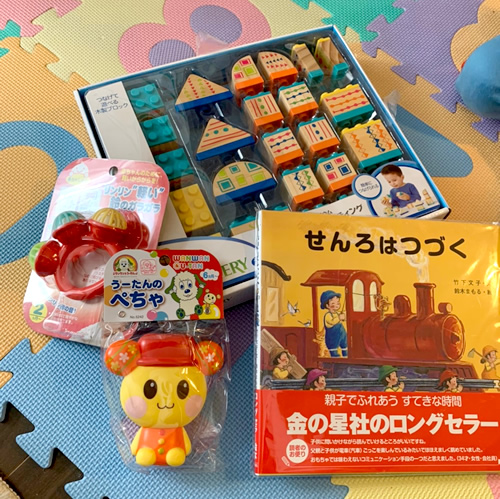 訪問先には、積み木ブロック、電車の絵本、5ヶ月の子用の音の鳴る鈴、うーたんの音の鳴るお人形を選びました。事前に好きなことや物を聞き、それに沿うものを選ぶようにしました。また、赤ちゃん用は舐めても大丈夫な素材であることに気をつけました。積み木で色々工作したり、音を鳴らしたりしてとても喜んでくれました。