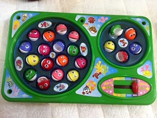 魚釣りのおもちゃ、プリキュアの折り紙、動物の鳴き声がする絵本を持参しました。保護者の方に事前に聞いていたので、子供たちが興味を持っているものを選びました。1歳の子が口に入れたりしなくていいように考えました。