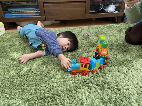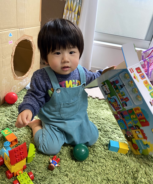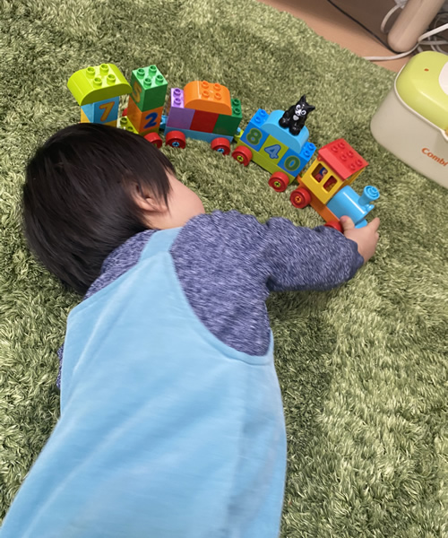 事前に、乗り物が好きと伺っていたので、1歳3ヶ月でも遊べるレゴの玩具を用意しました。長年遊べる物にしたかったので年齢が上がっても数字を学びながら遊べるものにしました。初めは何か分かっていなかったけれど、動かして乗り物のように遊ぶのを知ってからは、乗り物の音を口で呟きながら遊んでいました。