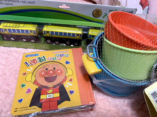 木製の電車、おままごとセット、アンパンマンのしかけ絵本をプレゼントしました。子どもが電車とおままごとに興味を持っていることをお母さんにお聞きしてそれに沿って選びました。おもちゃを渡したら興味を示してくれて、そのおもちゃでずっと遊んでくれていました。