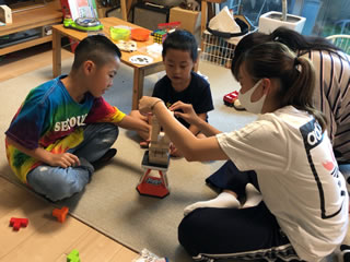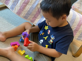 最初に自己紹介をして、事前に買っていた「水でくっつくキューブブロック」と、「108通りの形ができるキューブのおもちゃ」を見せて、一緒に遊びました。その他にも、子どもたちがやりたいジェンガなどのおもちゃを使って遊びました。お母さんからは、子どもたちが幼稚園に通っていた時のお話や、その頃のお母さんの悩みなどを聞きました。